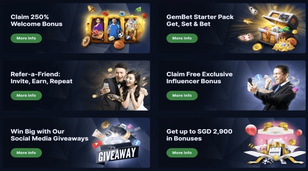 The Welcome Bonus is one of the main GemBet promotions and can be activated with a single deposit of SGD 30 or more. Players can choose between Slots, Sports, and Live Casino, depending on the product they want to play.